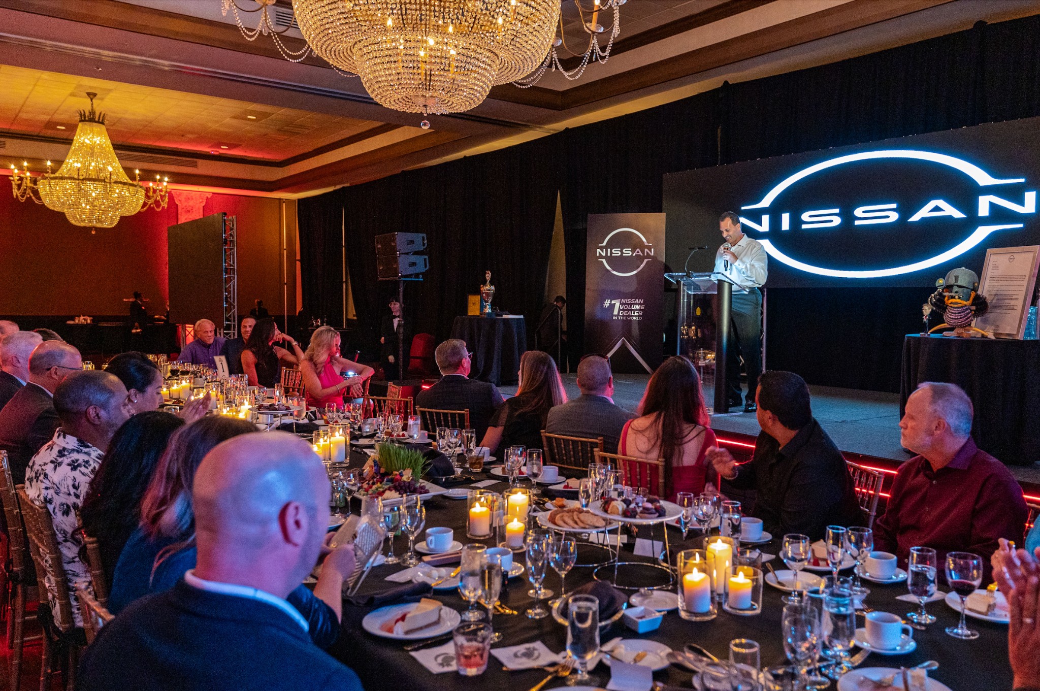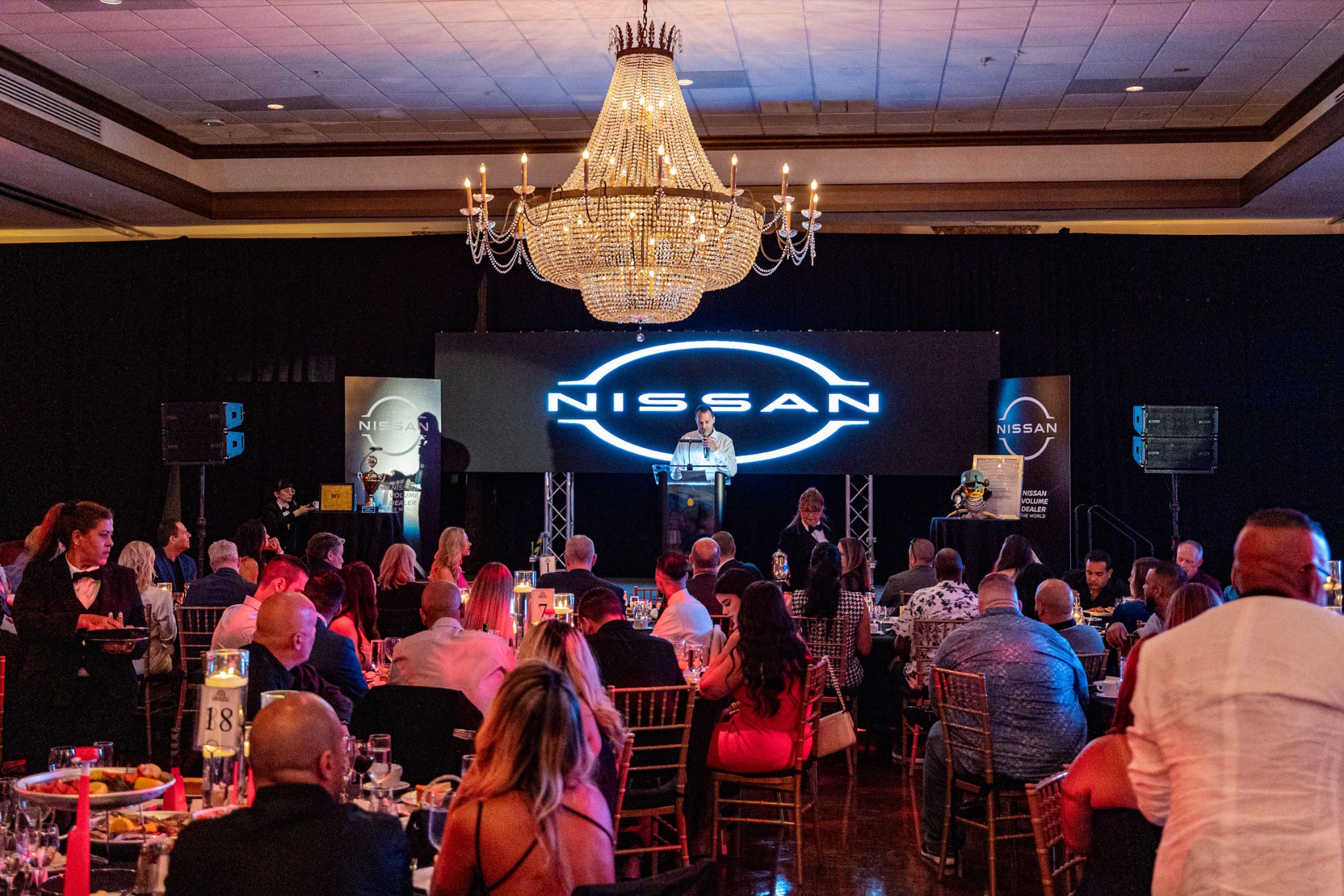 A large-scale corporate awards dinner celebrating Nissan’s #1 Volume Dealer in the World. The evening combined immersive lighting, branded scenic elements, live presentations, and refined dining to create a polished, high-impact experience for leadership and top performers.